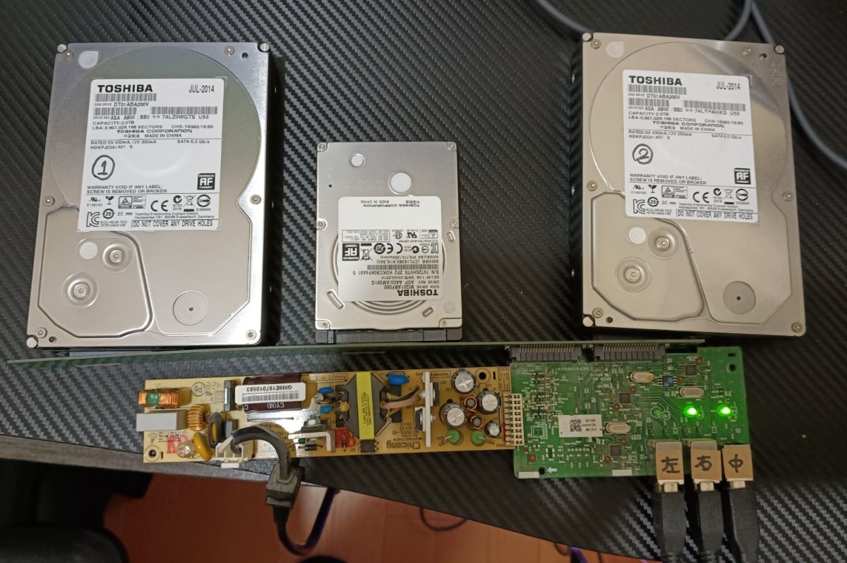 ちなみに、この3つのHDDをまとめて接続してる基盤はSATAのHDDケースを分解した時、USB端子と電源ケーブルを接続する為の基盤と同じ感じでした。